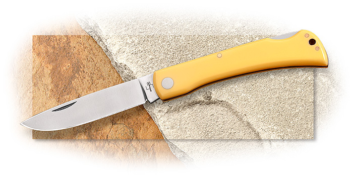These traditional folders are based on the Sod Buster style that was developed in the U.S.A. for farmers as early as the 18th century. The knives may be simple in design but their usefulness knows no bounds. The satin finished drop point blades are 8Cr13MoV at 58-60 Rc. The blade measures 3-3⁄4". It measures 4-5⁄8" closed. Both knives have yellow synthetic handle scales over brass liners. Both are lockbacks. A black zippered nylon pouch is included for storage. The large one weighs 3.6 oz. Made in China. Suggested retail is $48.95.