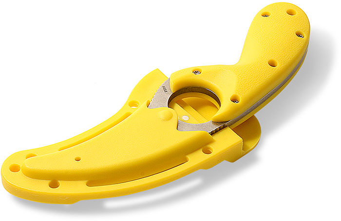 Over the years, the Bear Claw has become a go-to knife among whitewater rafters, river guides, water sports enthusiasts and emergency response personnel. The yellow textured handle is made of glass-reinfored nylon with the finger retention hole in the handle, giving you a secure hold in wet conditions. The yellow thermoplastic sheath has multiple mounting options for quick access when you need it.