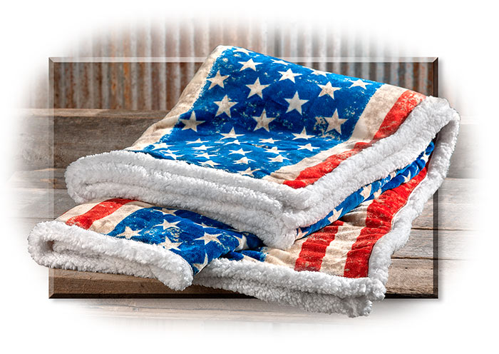 This exceptional throw is made of a warm blend of thick fleece, lined with super soft shearling. Great for wrapping up in at outside events or for curling up with on the sofa even when you don't need a nap. Machine wash cold and tumble dry low for easy care. 100% polyester. Patriotic, red and white stripes with white stars on a field of blue. Measures 54" x 68".