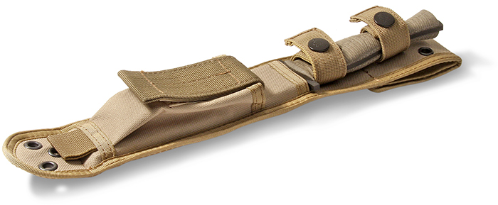 We include an A.G. Russell designed Ballistic Nylon sheath that is made with a kydex liner for safety. A pouch on the front will hold a large folding knife or a sharpening stone, and it is M.O.L.L.E. compatible. We have had to reach outside the U.S.A. for this sheath to get the quality and delivery we need.