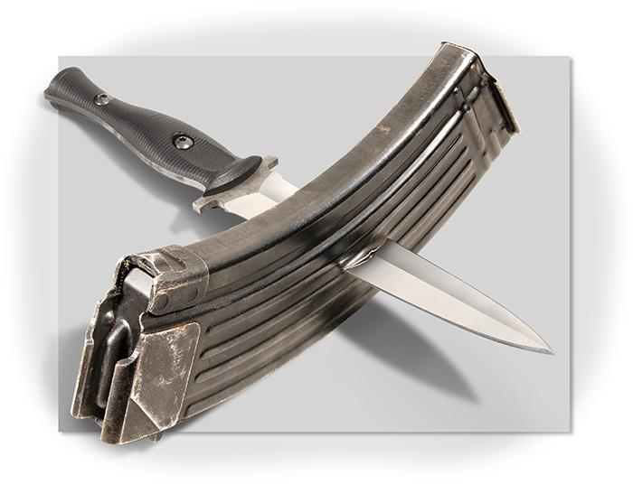 Once we had the Sandbox Dagger blades and handle scales finished, even before we marked and had them coated, we did some pretty rugged testing. The most impressive to me is illustrated in the photograph on this page. I was able to push the blade through an AK-47 Magazine with no damage to the tip, and the edge is still sharp." - Phil Gibbs, engineer. A.G. Russell Knives.