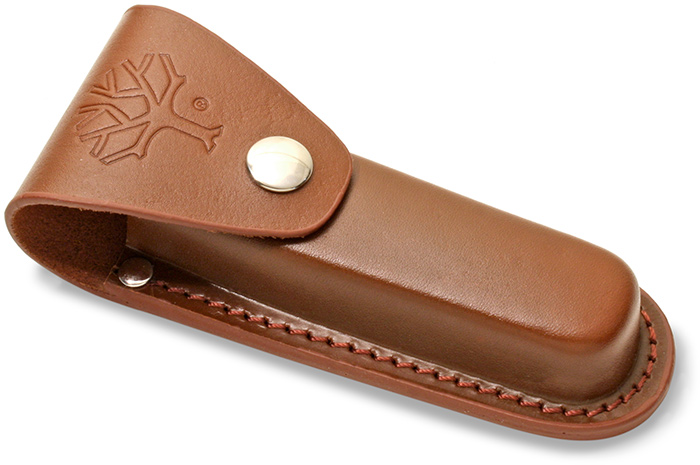 Both blades measure 4" in length and are satin finished D2 at 59-61 Rc. The Tree Brand logo is on the main blade. The handle scales are Stag. Some knives seem to have scales of European Stag and some with India Stag. The liners are brass. The bolsters, round Tree Brand shield and pins are nickel silver. Measures 5-1⁄4" closed. Weighs 6.4 oz. Includes a brown leather belt pouch. Boker manufactured. Suggested retail is $153.95.