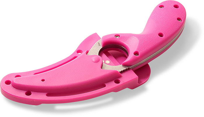 Over the years, the Bear Claw has become a go-to knife among whitewater rafters, river guides, water sports enthusiasts and emergency response personnel. The pink textured handle is made of glass-reinfored nylon with the finger retention hole in the handle, giving you a secure hold in wet conditions. The pink thermoplastic sheath has multiple mounting options for quick access when you need it.