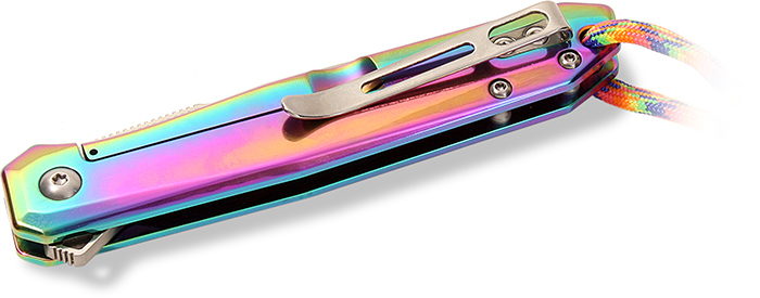 The 3-3/8" satin finished reverse tanto blade is 12C27 at 59-61 Rc. Includes a rainbow nylon lanyard. The single position deep carry pocket clip is positioned in the right-hand tip-up position. Measures 4-1/4" closed. Weighs 3.9 oz. Made in China.