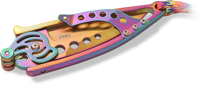 CRKT has revived an old favorite, the Van Hoy Snap Lock. This remarkable knife was inspired by a knife designed by Blackie Collins in the 1960s or early in the 70s, which was very much a two handed knife. Ed added a remarkable opening and closing device that turns this one into a one-hand knife. He has also totally redesigned the blade to bring it into the 21st Century. The entire knife - blade and handle - is coated in an iridescent rainbow Titanium Nitride.