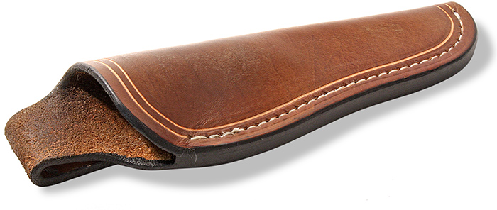 The 3-1/2" blade is D2 at 60-61 Rc. The handle scales are Thuya Wood with black fiber between the wood and the full tang. Measures 8-1/8" tip to butt. Weighs 5.8 oz., 8.3 oz. in the sheath. Includes a handmade brown leather pouch style sheath also made by Keith. Knife and sheath handmade in Arkansas.