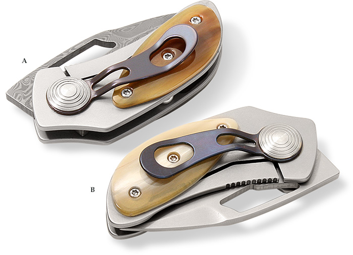 This is a small frame-lock with an applied horn scale on both the obverse and the reverse sides of the satin finished stainless frame. Opens and closes easily with one hand. The 1-1⁄2" drop point blade is available in either a bead-blasted N690 stainless or a stainless Damascus . The blue anodized clip on the reverse side of the handle allows for right-handed, tip- down carry. At just 2-1⁄2" closed, the Turtle is just about as P.C. as you can get. Weighs 2.0 oz. Made in Italy.